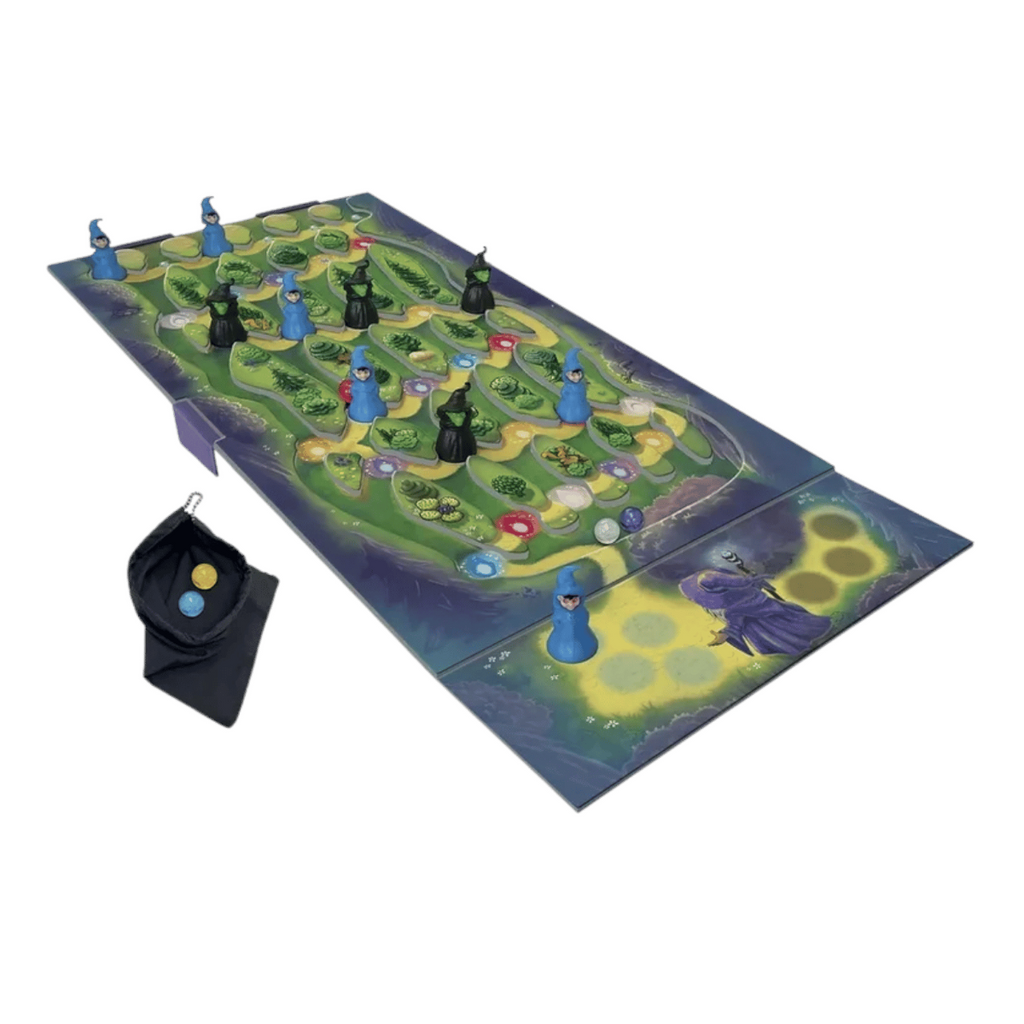 To set up, place supports on the game board to elevate the starting area, then place six sorcerers' apprentices in the back row and four witches on their designated starting spaces. Add the five colored will-o'-the-wisp marbles to the bag.
