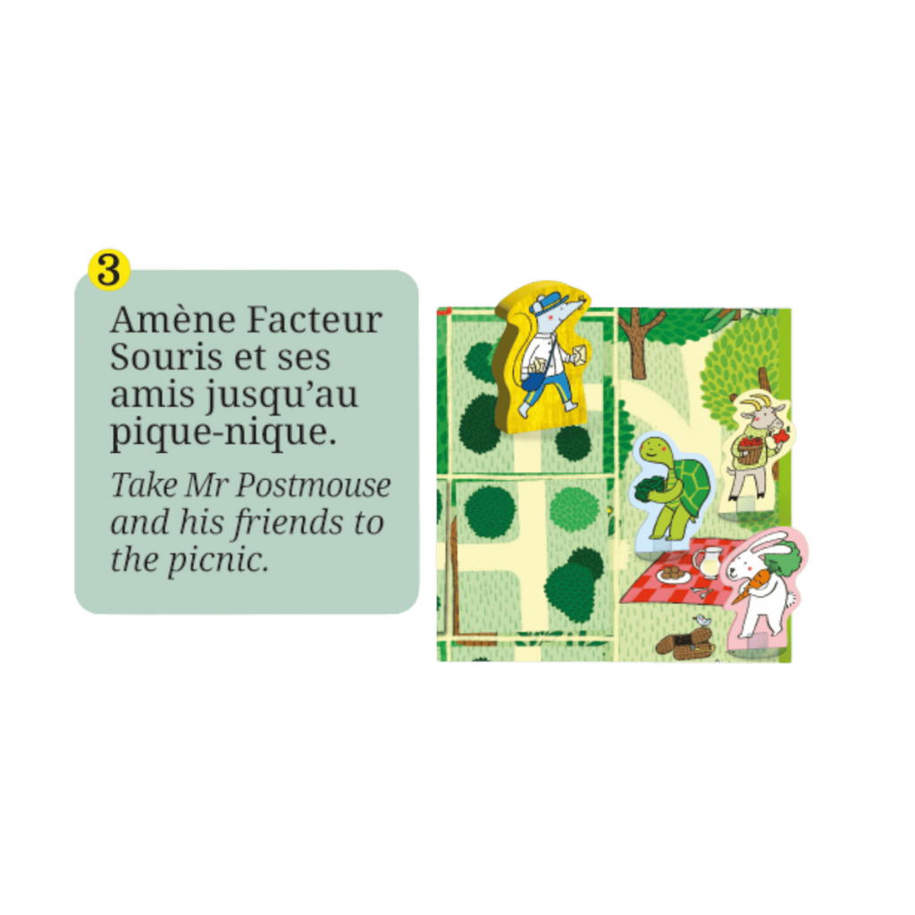 Together, players reveal and place tiles to build paths, move Mr Postmouse and his animal friends, and face challenges along the way. Rain may send him back home unless he has built a Tent, while Night tiles bring darkness closer with each turn. To win, Mr Postmouse must reach the picnic site before nightfall with at least four friends by his side.