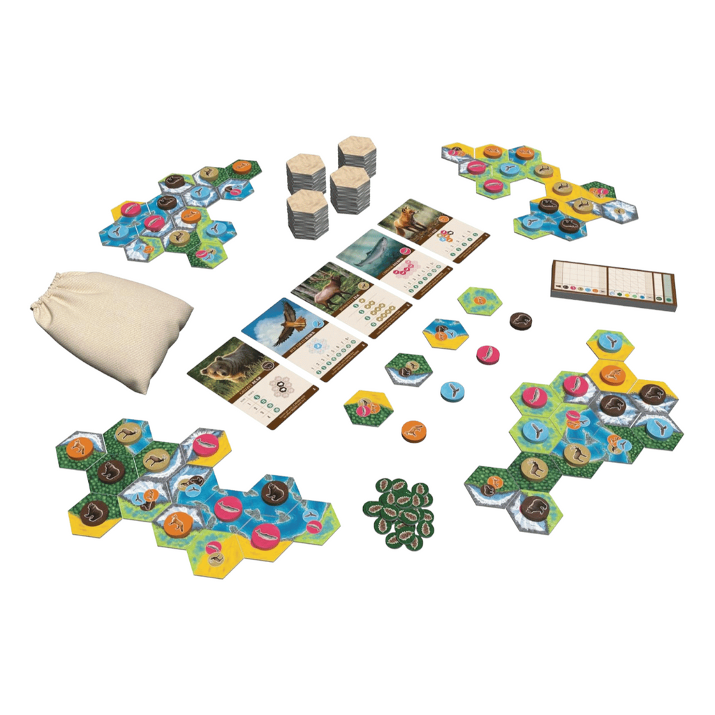 Ideally you can place habitat tiles to create matching terrain that reduces fragmentation and creates wildlife corridors, mostly because you score for the largest area of each type of habitat at game's end, with a bonus if your group is larger than each other player's. At the same time, you want to place wildlife tokens so that you can maximize the number of points scored by them, with the wildlife goals being determined at random by one of the four scoring cards for each type of wildlife. Maybe hawks want to be separate from other hawks, while foxes want lots of different animals surrounding them and bears want to be in pairs. Can you make it happen?