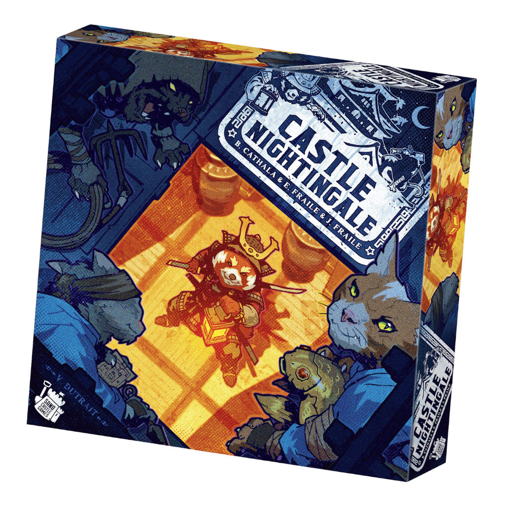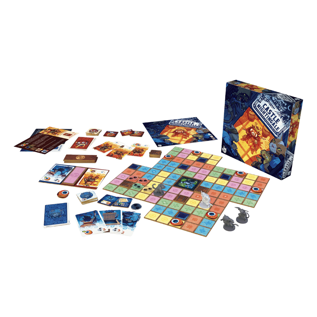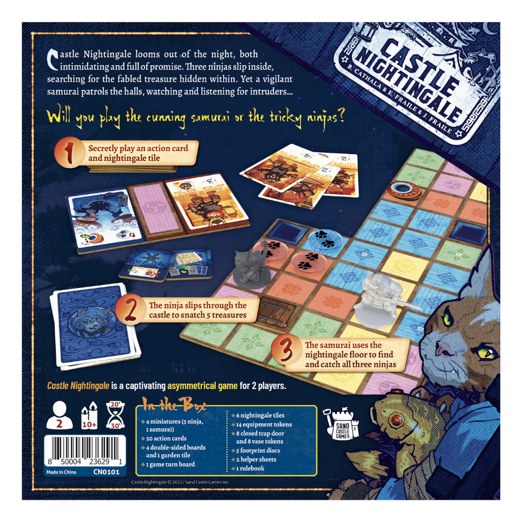 Two players face off in Castle Nightingale, with the ninja player trying to steal five relics before the samurai player can capture the three ninja thieves. The castle is comprised of an inaccessible garden surrounded by four double-sided floor boards, each showing two secret passage spaces and areas in five colors.