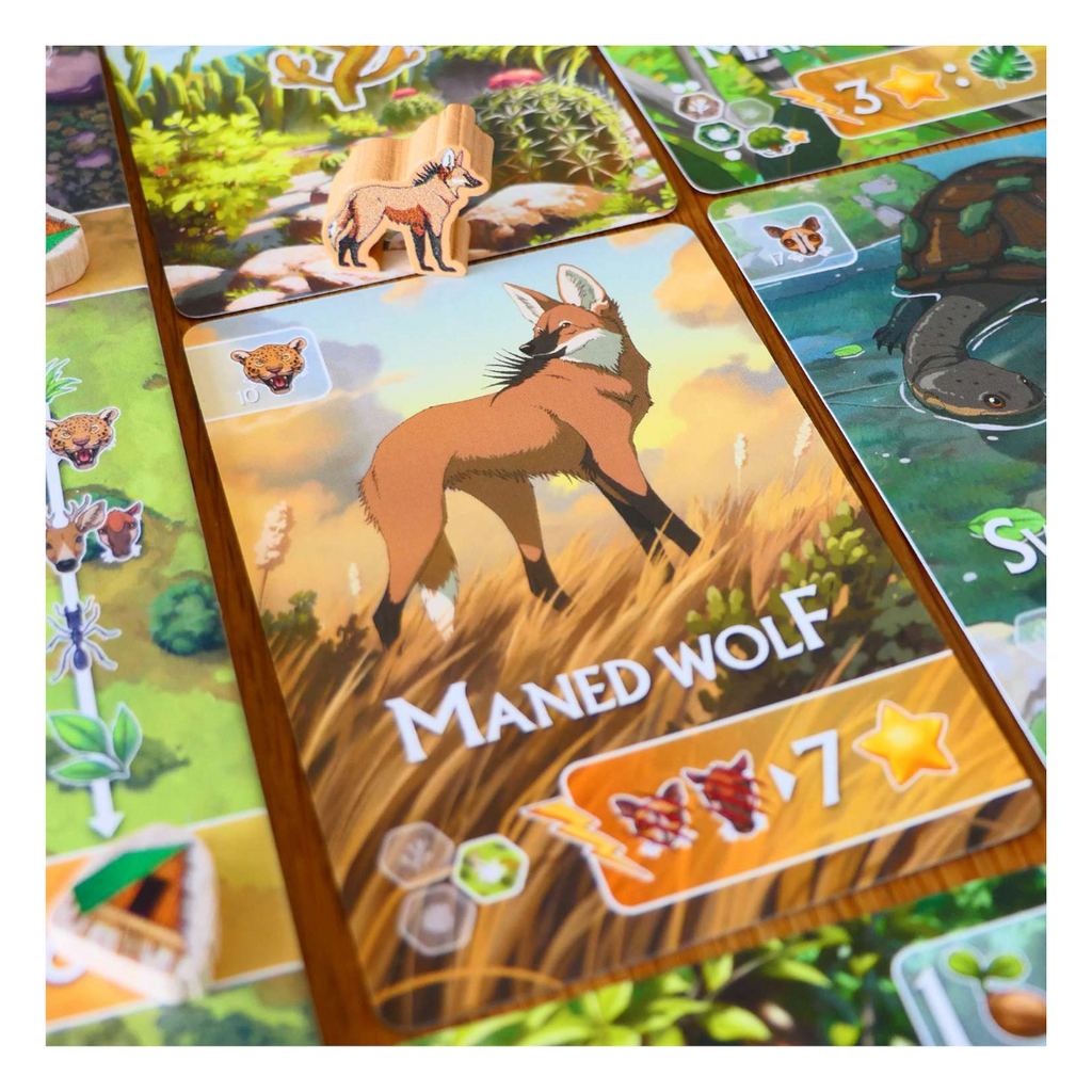 Rewild: South America is a unique, medium-weight, card-driven, engine-building board game for nature enthusiasts with a heart for wildlife that can be enjoyed in 45-60 minutes.