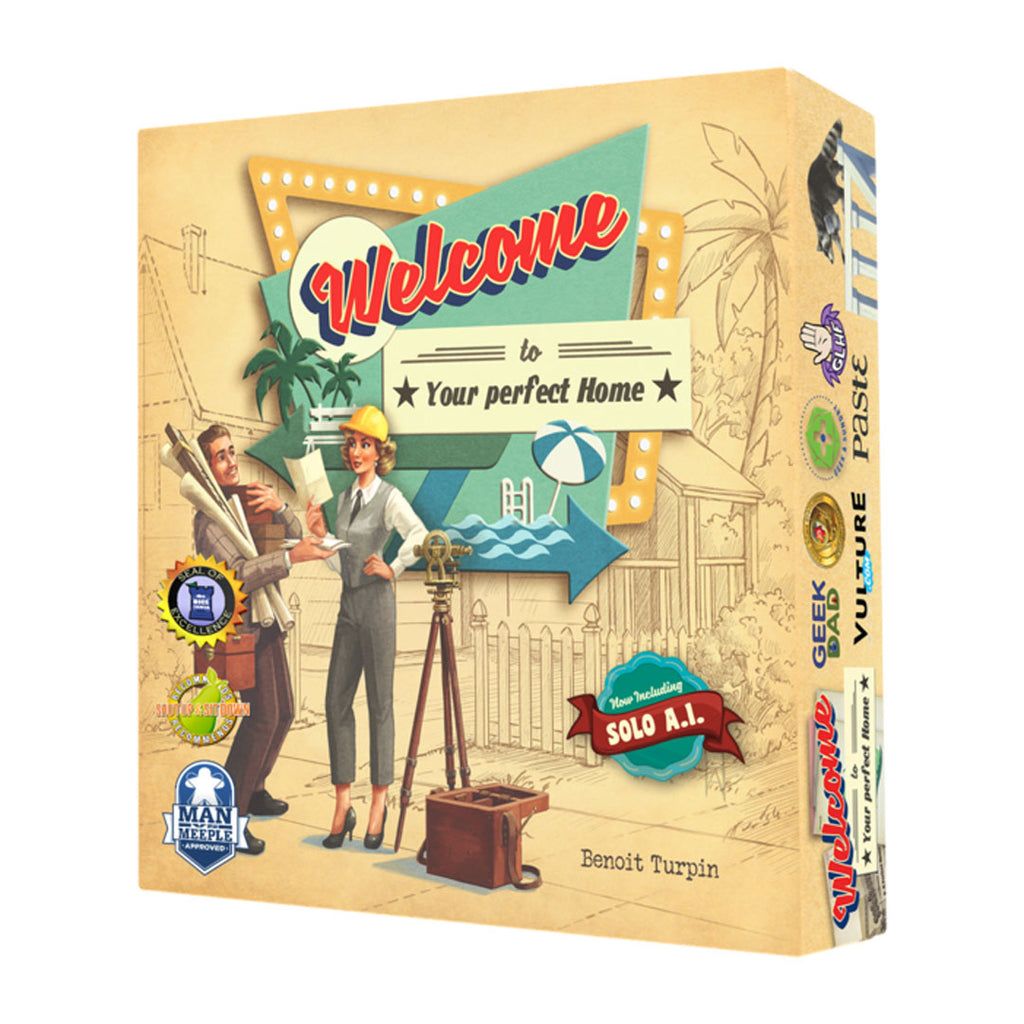 Welcome To... plays like a roll-and-write dice game in which you mark results on a score-sheet...but without dice. Instead you flip cards from three piles to make three different action sets with both a house number and a corresponding action from which everyone chooses one. You use the number to fill in a house on your street in numerical order. Then you take the action to increase the point value of estates you build or score points at the end for building parks and pools. Players also have the option of taking actions to alter or duplicate their house numbers. And everyone is racing to be the first to complete public goals. There's lots to do and many paths to becoming the best suburban architect in Welcome To...!