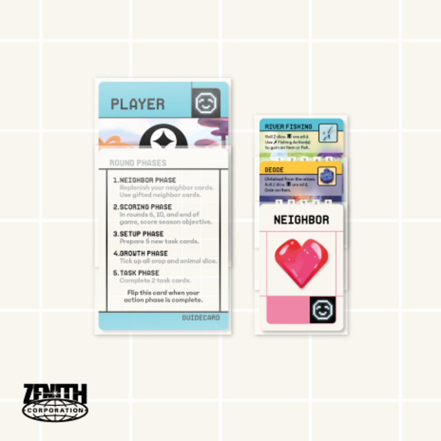 Players earn victory points for collecting badges, completing season objectives, being the best neighbor, and filling up their Cargo Manifest with goods to send back to Zenith HQ. In the end, the player with the most victory points wins!