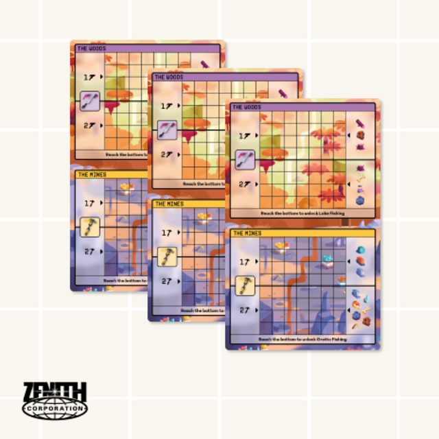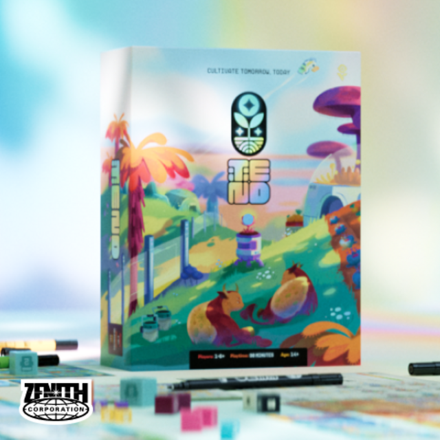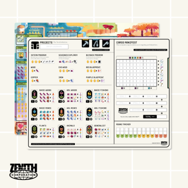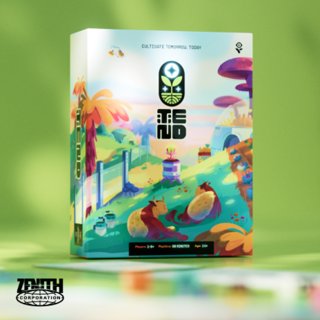 Tend is a "flip and write" game where players are each building up their own farm and collecting the greatest selection of goods to send back to Zenith HQ for study. All players will be using the same deck of action cards each round to simultaneously take actions on their own sheets.