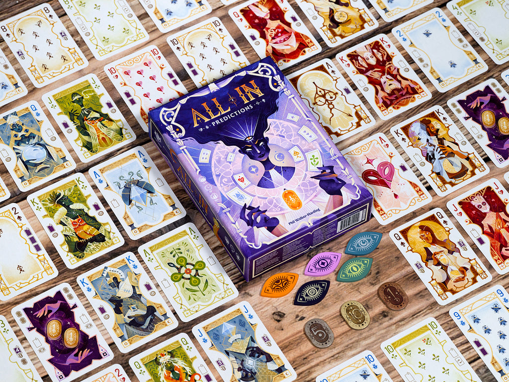 In All In: Predictions, players become gifted foretellers vying to shape destiny itself. Combine hand management with strategic foresight in this fast-paced game inspired by classic poker in which only one prediction will unfold. Play cards, bend probabilities, and guess who holds the strongest hand to claim the pot.