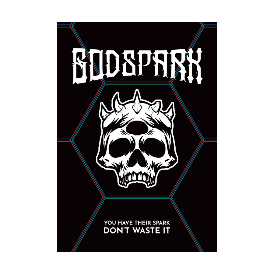 Godspark is a tabletop adventure game in which players take on the role of Saints reborn in a graveyard of gods. Using a few six-sided dice and a deck of playing cards, players explore the graveyard, fighting angels, meeting other Saints, and scavenging the divine energy that they can use to perform miracles and eventually Ascend and win the game.