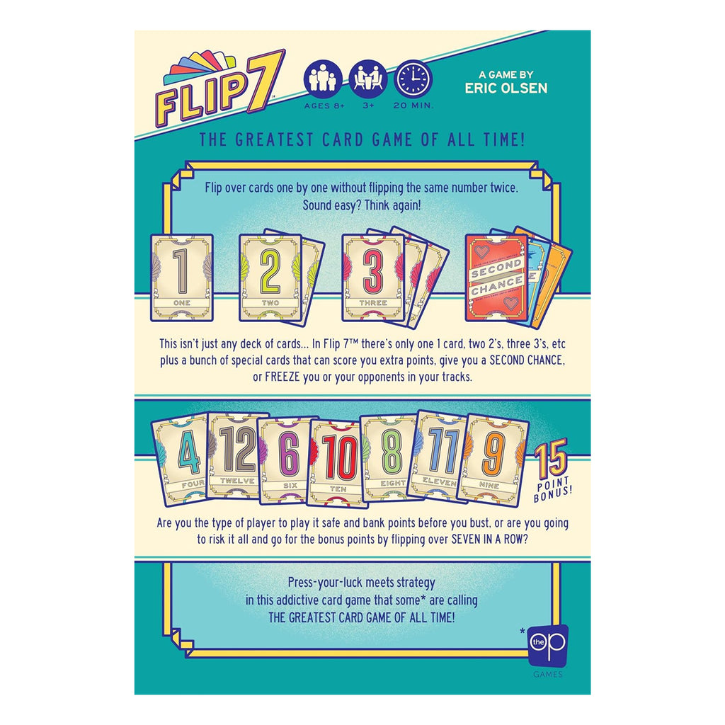 Sound easy? Think again! This isn't just any deck of cards… In Flip 7 there's only one 1 card, two 2's, three 3’s, etc plus a bunch of special cards that can score you extra points, give you a second chance, or freeze you or your opponents in your tracks.
