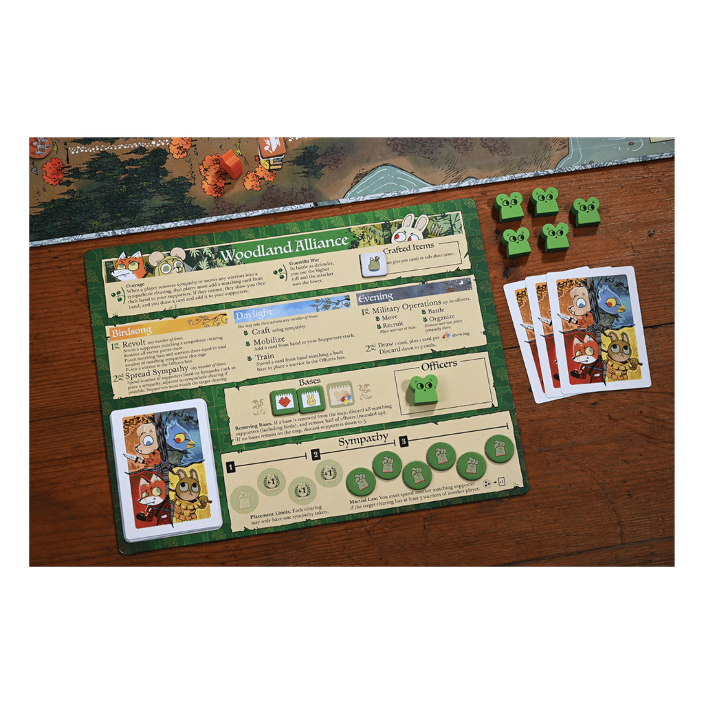 The nefarious Marquise de Cat has seized the great woodland, intent on harvesting its riches. Under her rule, the many creatures of the forest have banded together. This Alliance will seek to strengthen its resources and subvert the rule of Cats. In this effort, the Alliance may enlist the help of the wandering Vagabonds who are able to move through the more dangerous woodland paths. Though some may sympathize with the Alliance’s hopes and dreams, these wanderers are old enough to remember the great birds of prey who once controlled the woods.