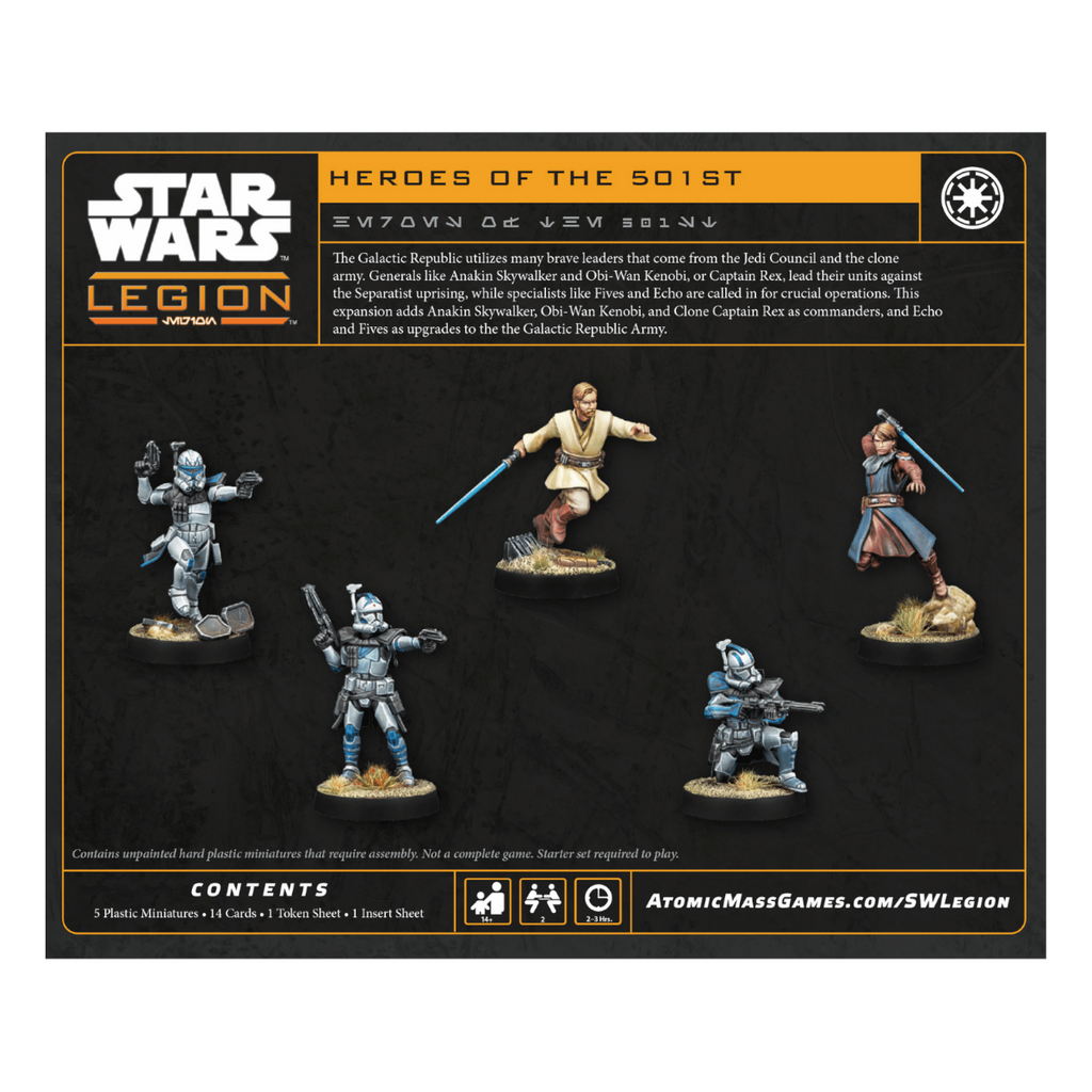 This expansion adds three Commander options and two Clone Trooper upgrade character options to the Galactic Republic Army. The pack includes new hard plastic sculpts of Obi-Wan Kenobi, Captain Rex, and Anakin Skywalker, each of which can be used as a Commander option in Galactic Republic armies. Additionally, this box contains new hard plastic sculpts of the clone ARC troopers Fives and Echo, who can be added to various clone trooper units as upgrades. All characters in this box are resculpts of their previously released versions and share the same updated rules as them. Only the miniatures themselves are new. This box also updates the cards to the current live version.